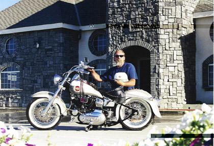 My wife took this shot right before a show that the bike took a first place trophy at. I bought this 78' model as a basket case with the intention of doing a quick fix up and sell to move on to a newer bike. Something happened along the way. Every time I put a cleaned up old part on it I wasn't satisfied until it was near perfect. I slowly changed my way of thinking into making this old bike a keeper. It took 2-1/2 years of nights and weekends to put back together. I rebuilt,fabricated, and painted it myself. It's a 2 tone of white pearl and simulated granite. Its been stretched 4'' and dropped 4". Its probably 4" fatter too. The swing arm was replaced with a rigid weld in component. The motor has the usual trick stuff (cams, carb, 10:1CR, Spike ignition) and not stroked. Its still a stock 1000 bored 20 over. I liked the older look of the knuckles, pans, and I wanted to incorporate some of those styles.